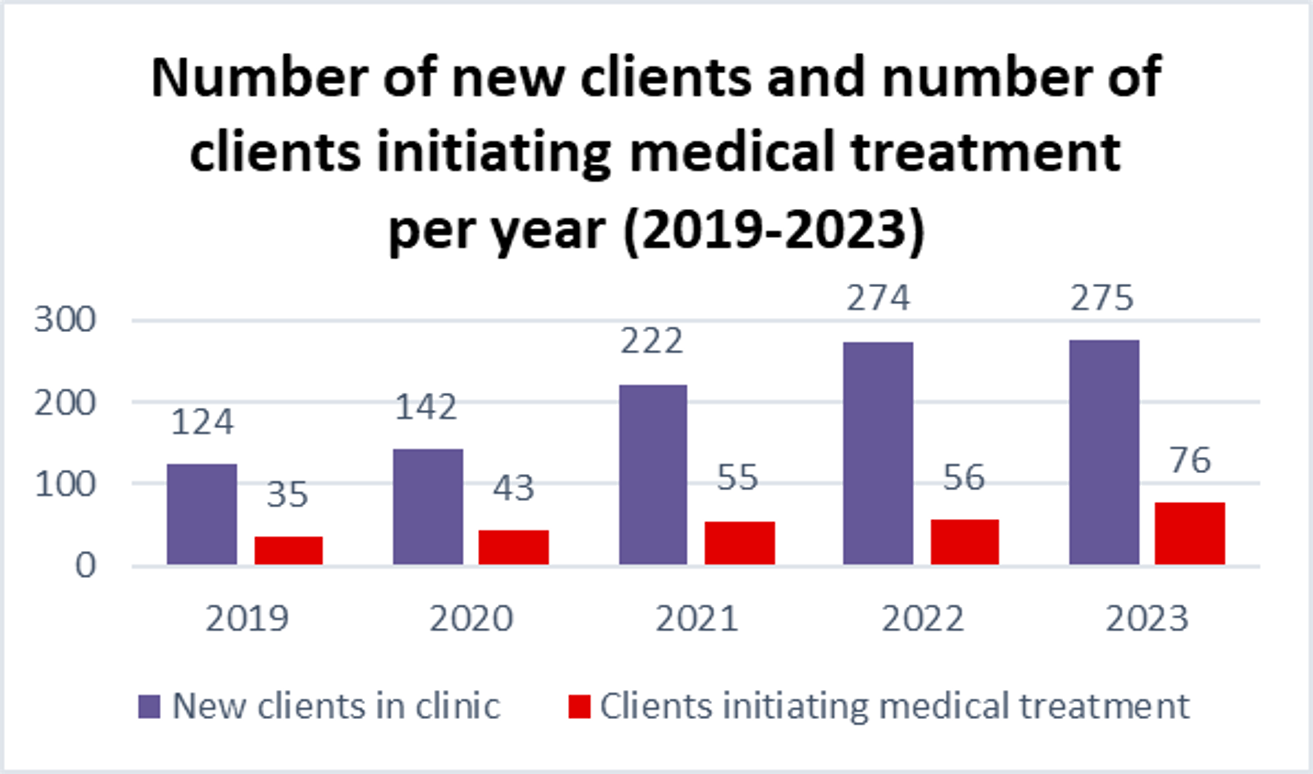 Denne tabellen viser at de fleste klienter hos HKS søker psykososial støtte eller råd, og ikke søker medisinske behandling hos oss. Vi har likevel sett oss nødt til å øke klinikkens legekapasitet betydelig de siste årene. Klienter som starter medisinsk behandling har vanligvis benyttet klinikken i flere måneder eller år i forveien, og snakket med våre sexologer jevnlig over tid. Hver persons vei til medisinsk behandling varierer, men følger retningslinjene våre.